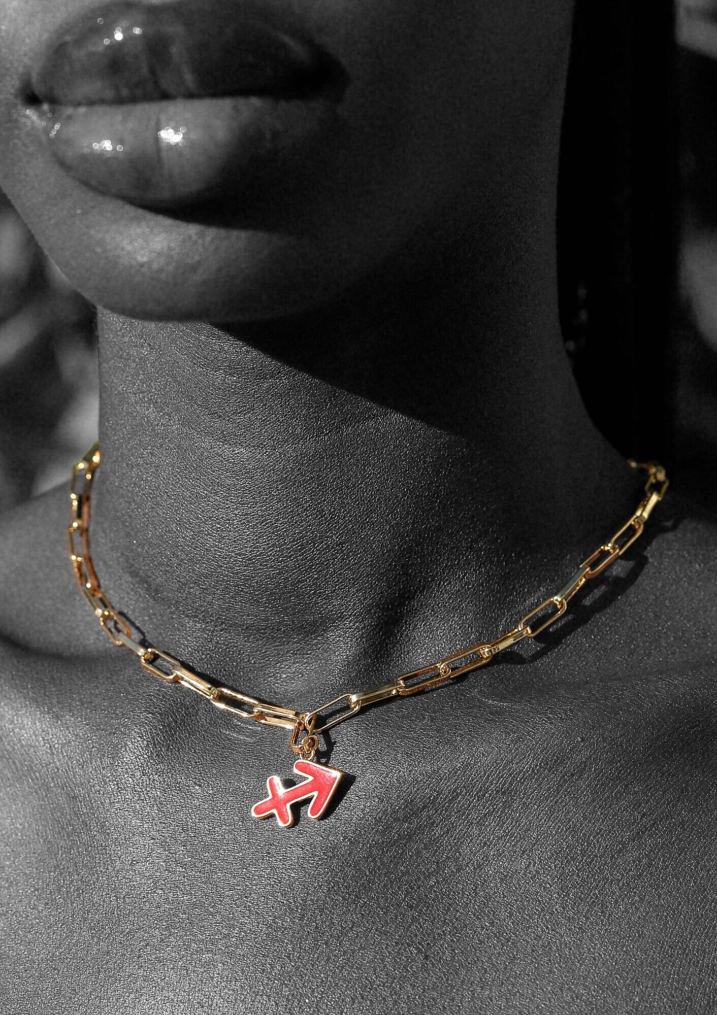Medalla Sagitario en latón chapado en oro de 18 k con esmalte rojo y cadena de eslabones. Joya signo zodiacal moderna, ideal como regalo de horóscopo.
